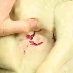- Roll four balls of marzipan or white modelling chocolate and smooth them onto the ends of the severed leg to make the knuckle joints.